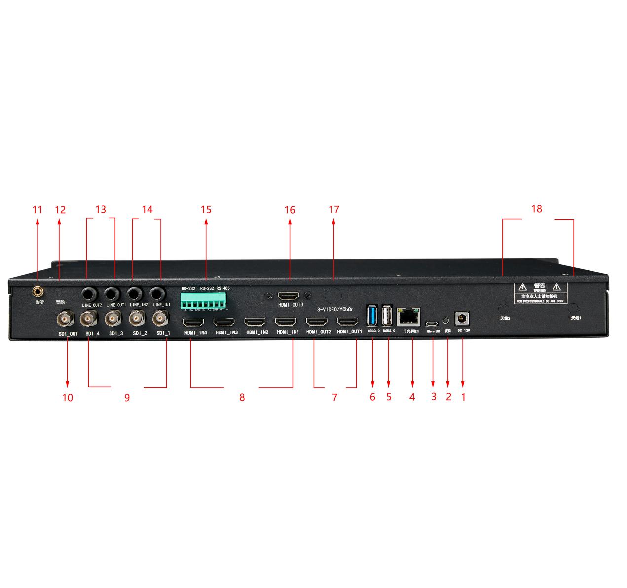 9 | SDI OUT-1-4 | SDI信号输入接口,支持SDI带音频输入 |